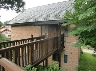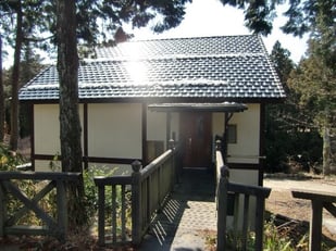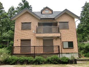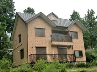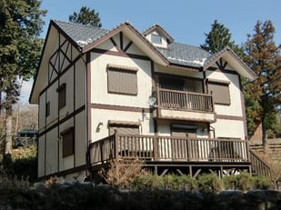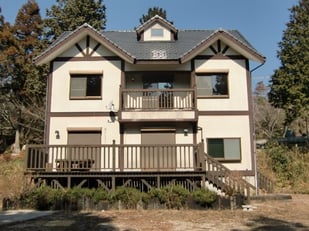築10年の外壁改修物件・・・三重県北西部、鈴鹿山脈の尾高高原に建てられた別荘・・・ハーフティンバー小屋組み風の立派な建物で、まだ築10年でしたが、木々の中にあるため、サイディング+白い塗装仕上げの外壁の汚れがひどく、その対策と外観のイメージチェンジも目的。既設サイディングの上に、下地造作後、「ニチハ マジックガードサイディング」張り仕上げ、としました。