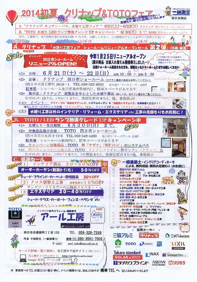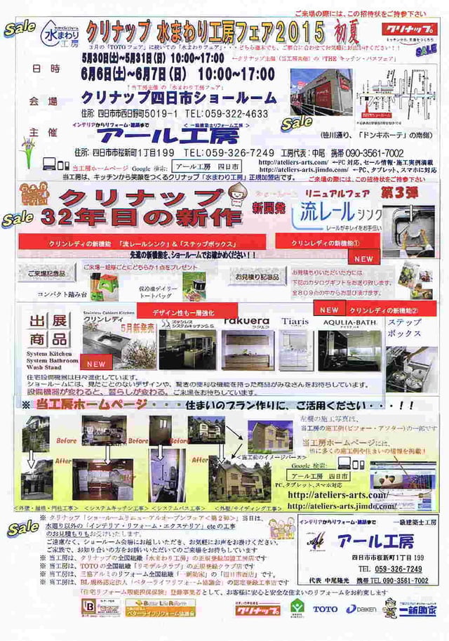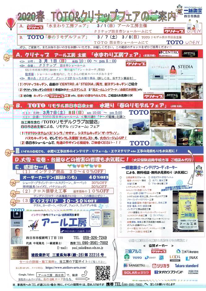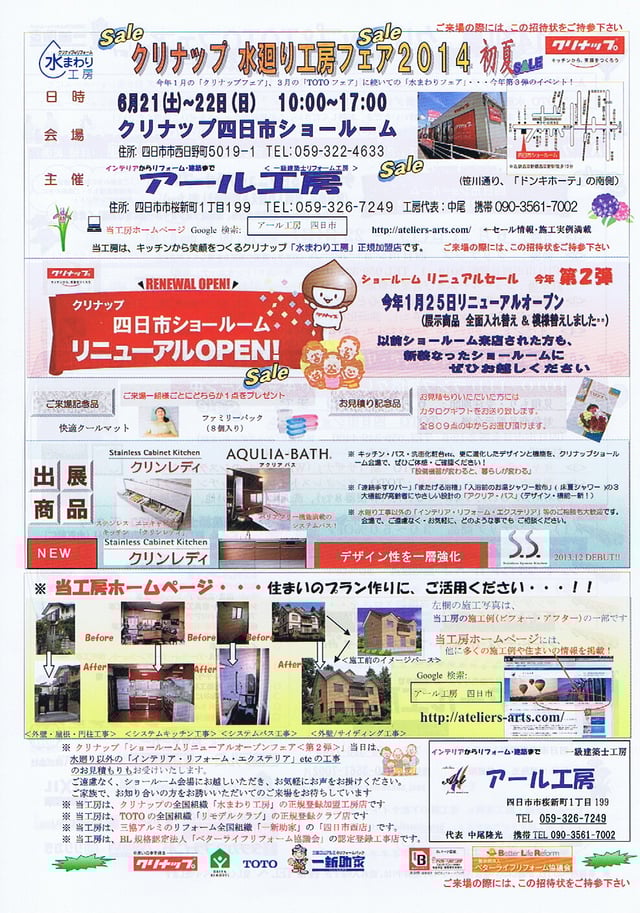 <お詫び>コロナウィルス感染拡大防止への対応により、下記3月1日(日)のアール工房主催「クリナップ水まわりフェア」を、中止とさせていただきました。